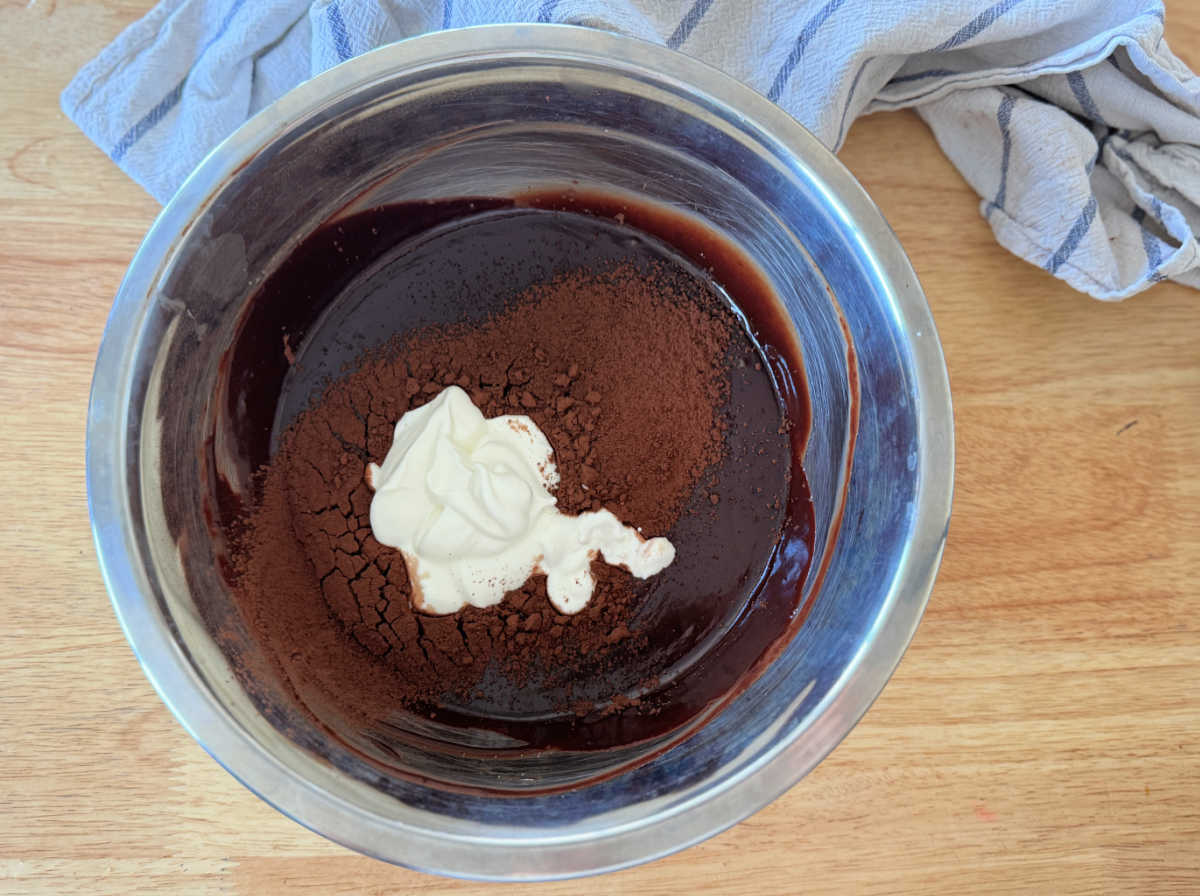 • מנפים את הקקאו לתערובת, ומוסיפים שמנת חמוצה. מערבבים היטב עד לאיחוד.