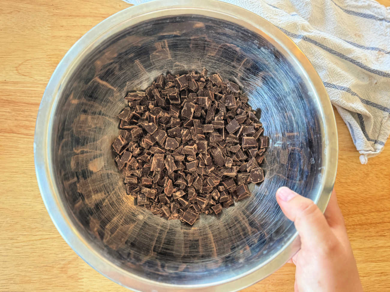 • קוצצים את השוקולד לחתיכות קטנות, ומניחים בקערה.