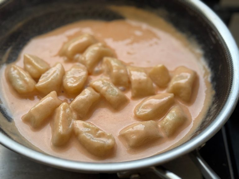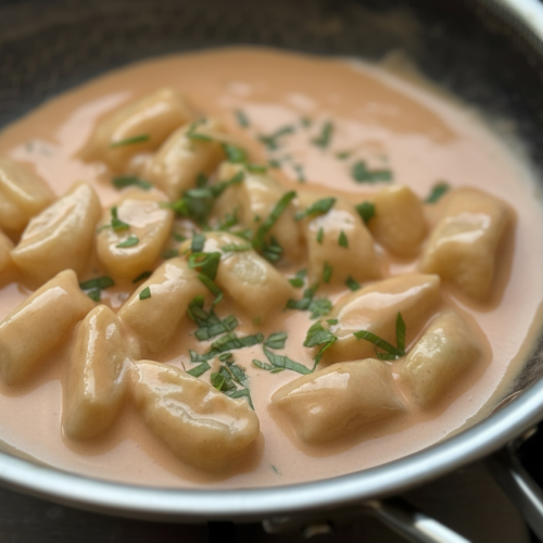 - מעבירים את הניוקי המוכנים הישר לתוך רוטב שאוהבים. כאן בחרתי ברוטב עגבניות ושמנת.