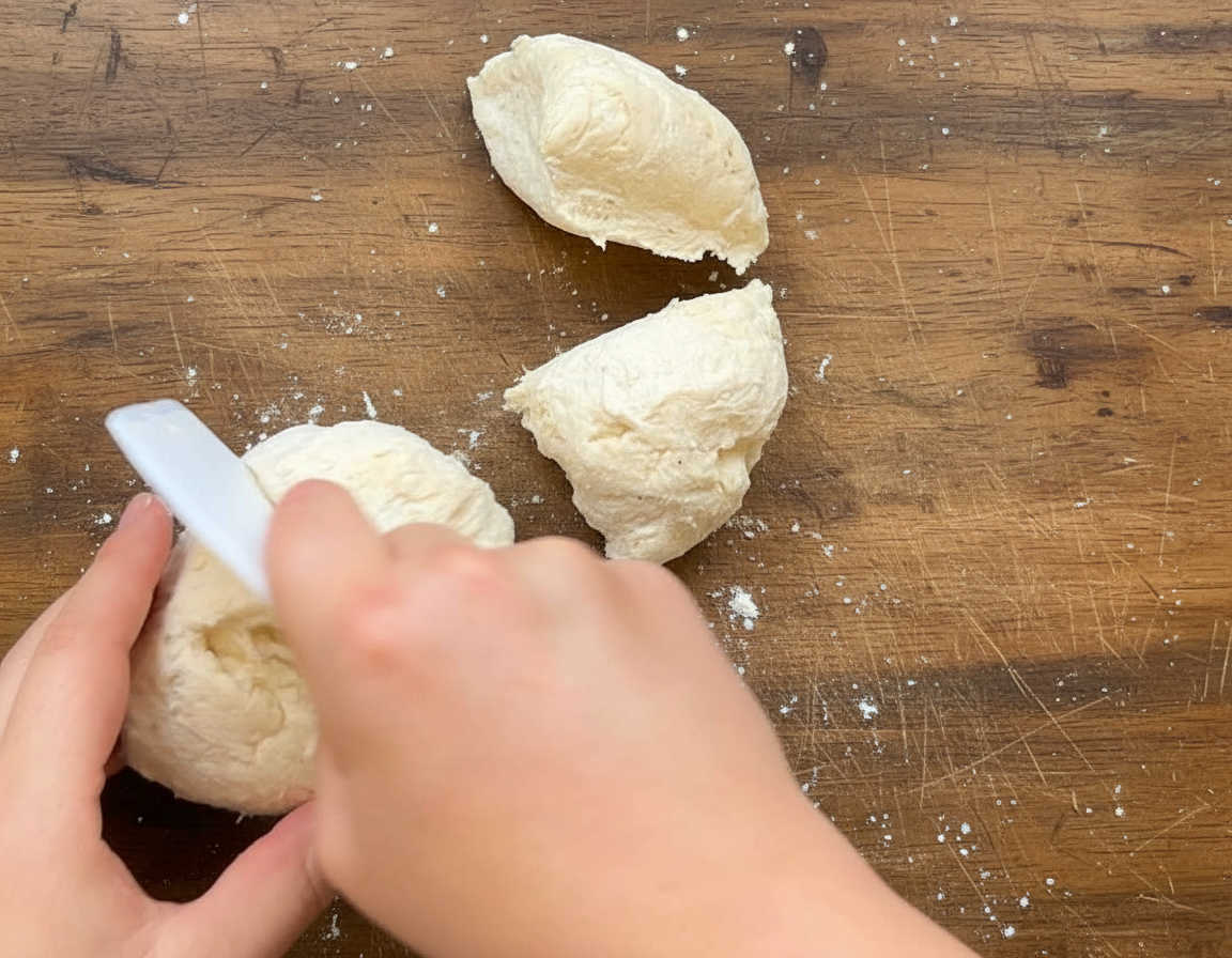 - בעזרת סכין או קלף, מחלקים את הבצק ל-4 חלקים.