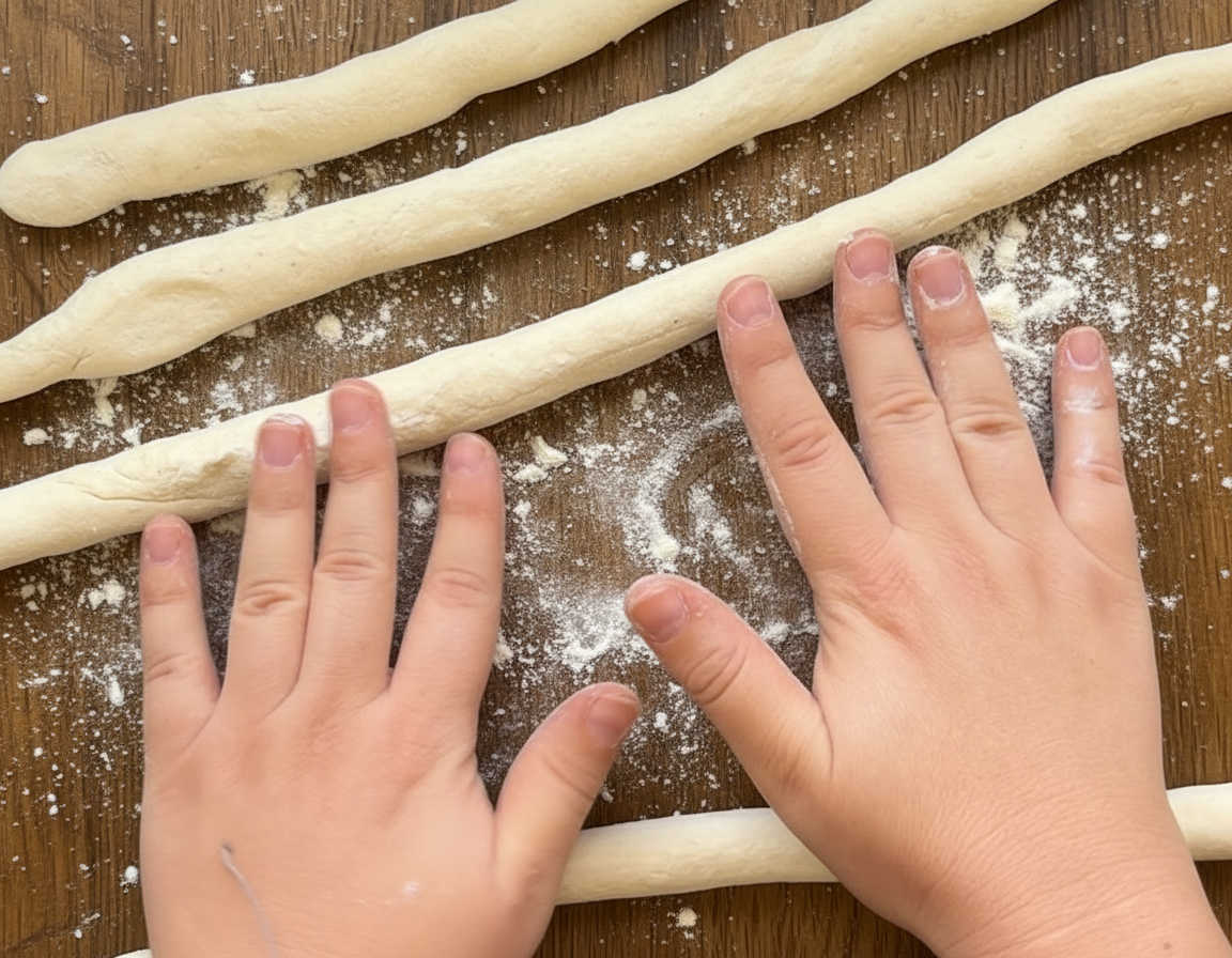 - שוב מקמחים את משטח העבודה, ומתחילים לרדד כל חלק מהבצק לנחש.