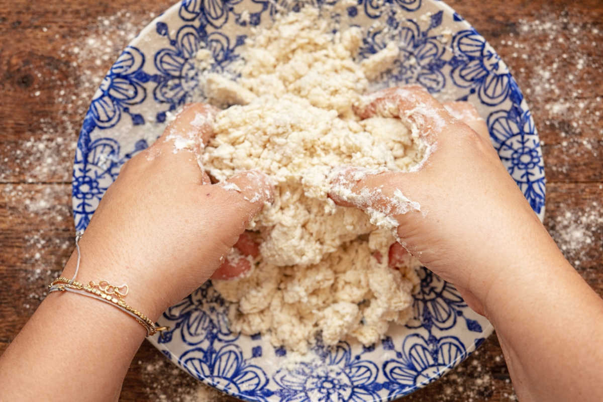 - בקערה, מערבבים עם כף או מזלג גבינה לבנה/יוגורט יווני עם קמח, פקורינו/פרמז׳ן מגוררת, מלח ואגוז מוסקט. ממשיכים לערבב עם הידיים, עד שהחומרים מתאחדים לבצק דביק מעט, ואז מעבירים את הבצק למשטח עבודה וממשיכים לעבד אותו ולאחד אותו לכדי גוש. לא צריך ללוש את הבצק, רק מאחדים אותו יחד. אם צריך, מוסיפים עוד קצת קמח.
