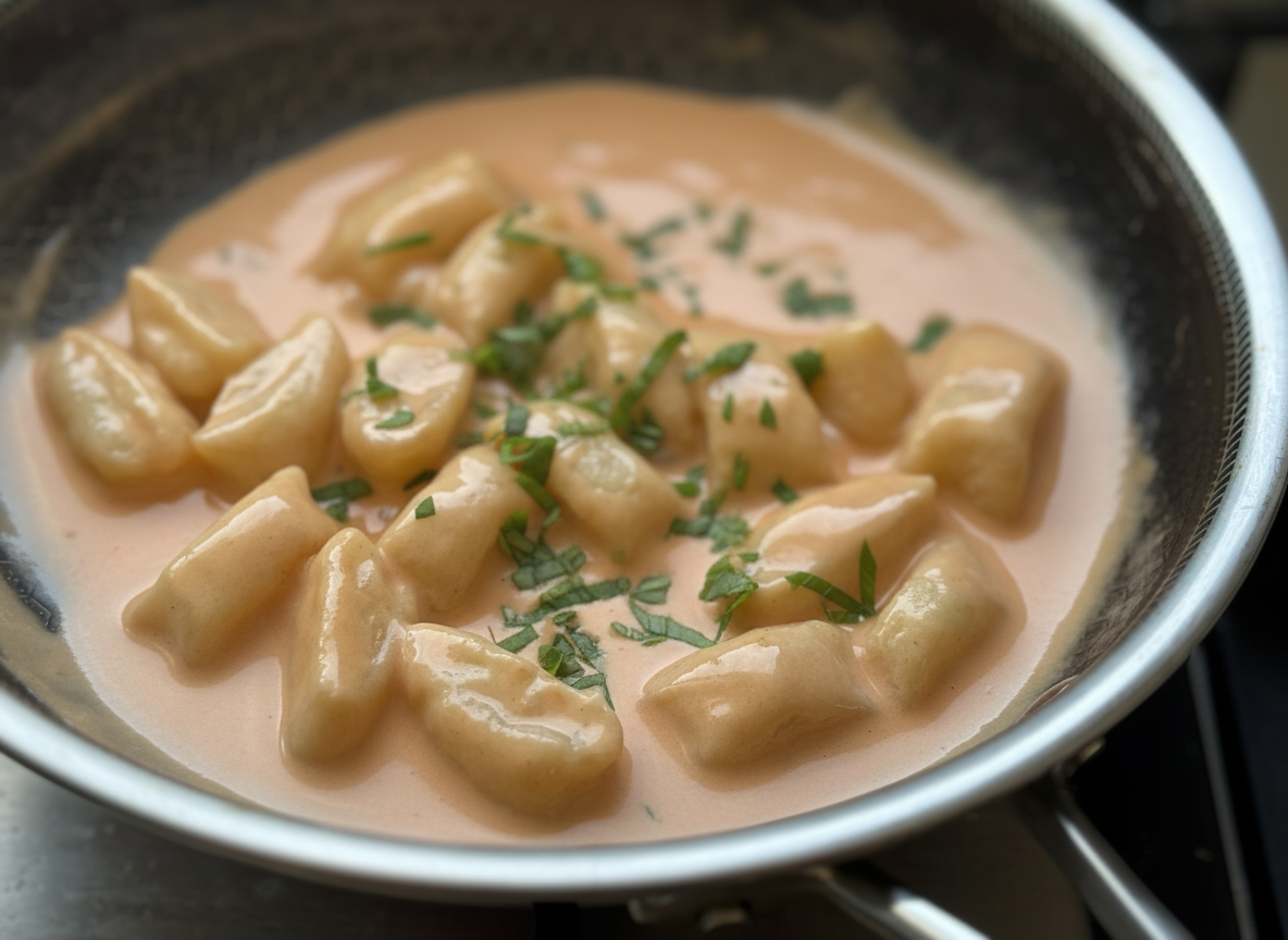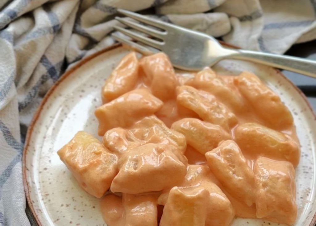- מעבירים את הניוקי המוכנים הישר לתוך רוטב שאוהבים. כאן בחרתי ברוטב עגבניות ושמנת.
