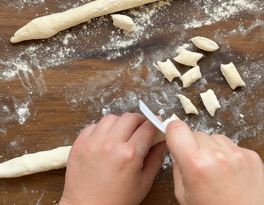 - בעזרת קלף או סכין חדה, קורצים את הניוקי בגודל הרצוי (כ- 3 ס״מ אורך). אם צריך עוד קצת לקמח, עשו זאת.