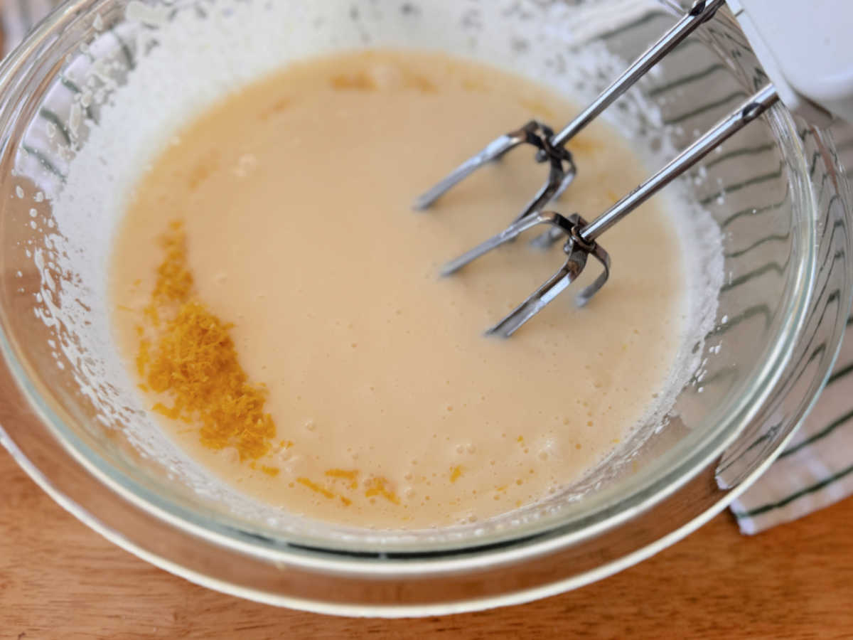 - מגררים את הקליפה מהלימון, חוצים אותו וסוחטים את המיץ. מוסיפים את גרידת הלימון והמיץ לבלילה ומקציפים עד לאיחוד המרכיבים.