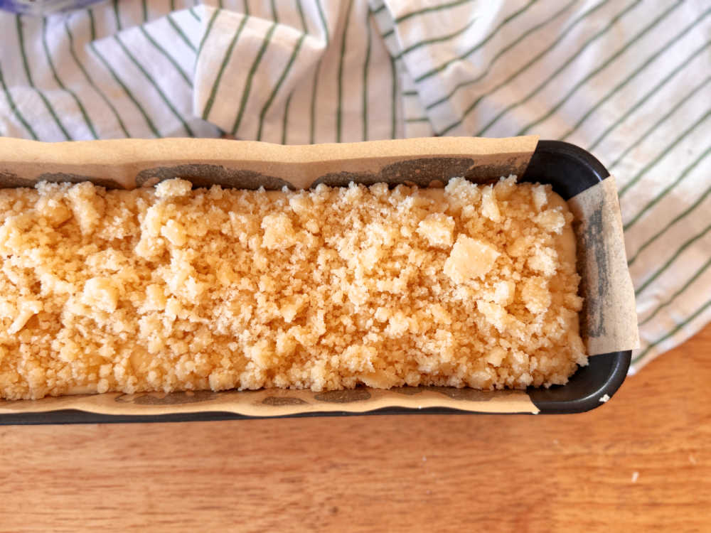 - מעבירים את הבלילה לתבנית האפייה המשומנת, טופחים את התבנית בכוח על משטח העבודה (כדי להפטר מבועות אוויר בתערובת).בעזרת האצבעות, מפוררים את הקראמבל על גבי הבלילה בנדיבות.