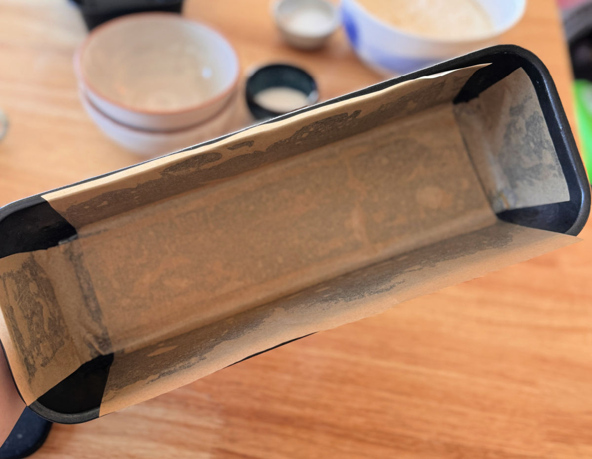 - מחממים תנור על חום בינוני-גבוה (180 מעלות). משמנים תבנית עוגה מאורכת ומרפדים אותה עם נייר אפייה (כדי שיהיה קל לשלוף את העוגה מהתבנית). אם משתמשים בתבנית חד פעמית, אין צורך לרפד בנייר אפייה.