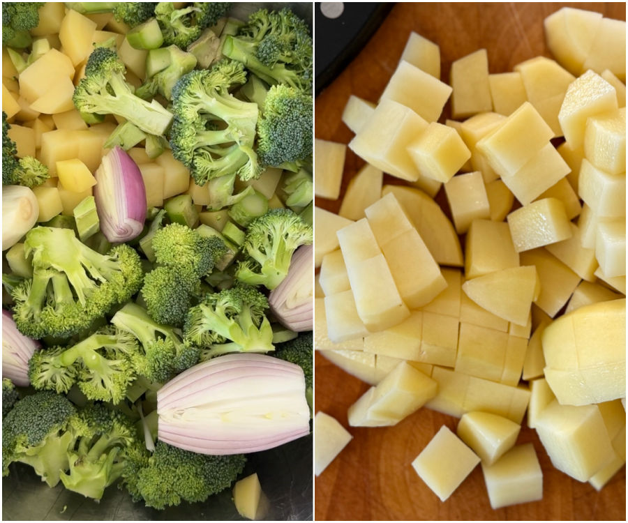 - מחממים תנור על חום גבוה (220 מעלות).קולפים את תפוחי האדמה וחותכים לקוביות קטנות (2 ס״מ בערך). את גבעול הברוקולי חותכים לקוביות קטנות, ואת התפרחת מחלקים לפרחים. את הבצלים/שאלוטס קולפים וחוצים.