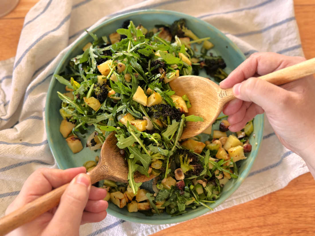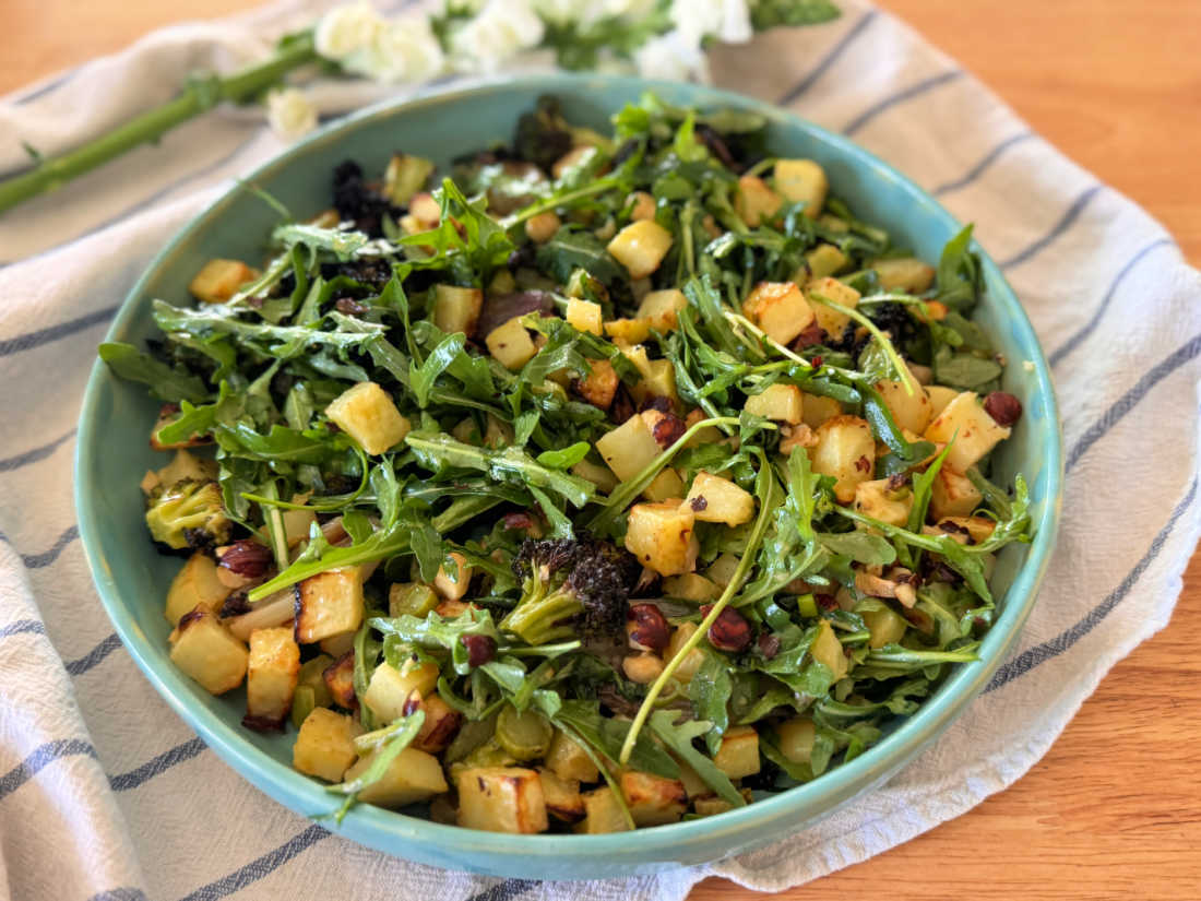יש כאן ברוקולי תפוחי אדמה ובצלים צלויים בתנור, שאחר כך מערבבים עם אורוגולה או כל חסה כיפית אחרת שאוהבים, וינגרט חרדל ומייפל מתקתק ושברי אגוזי לוז שמקשטים את הכל מעל.