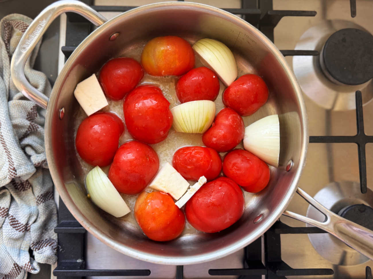 - בסיר בינוני שמים עגבניות שלמות או חצויות, בצל, חמאה ומלח. אין צורך להסיר את עוקץ העגבניות.
