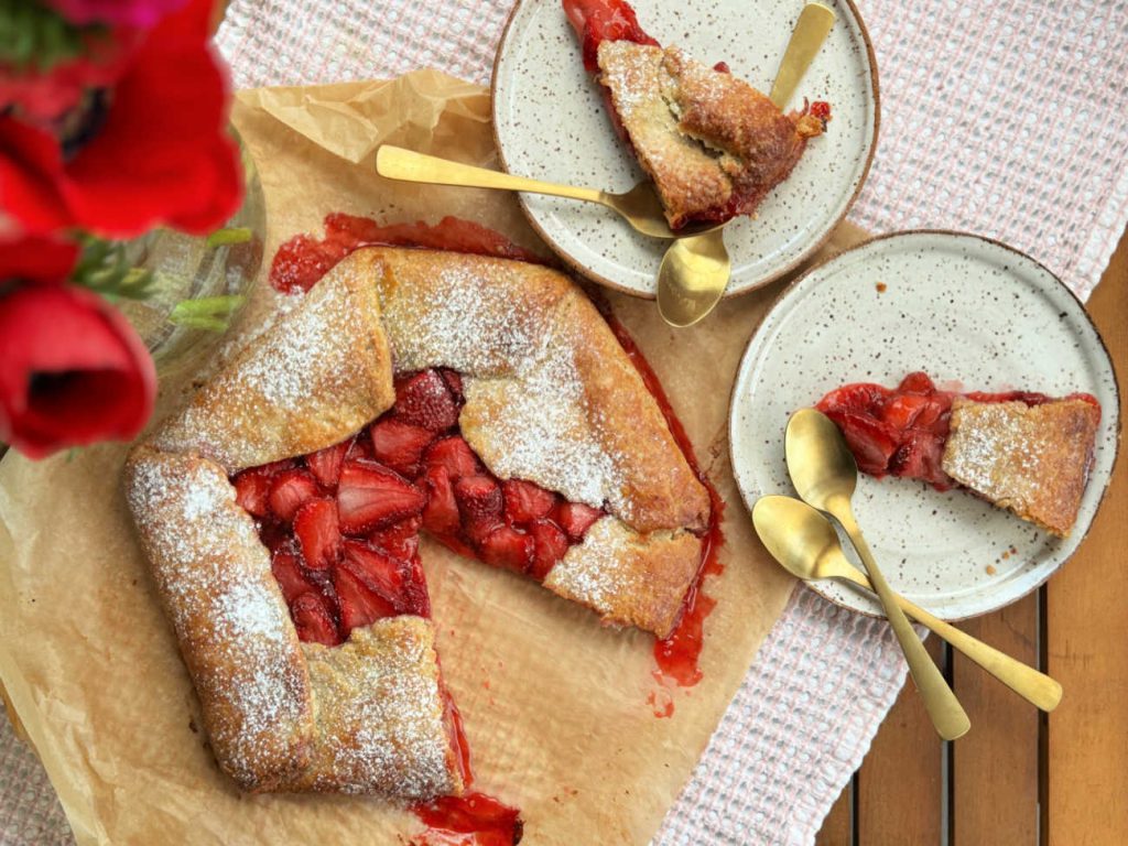 מפזרים את תערובת התותים על גבי עיגול הבצק, שמים לב שהתערובת בגובה יחסית אחיד, ומשאירים מעט שוליים (4-5 ס״מ).