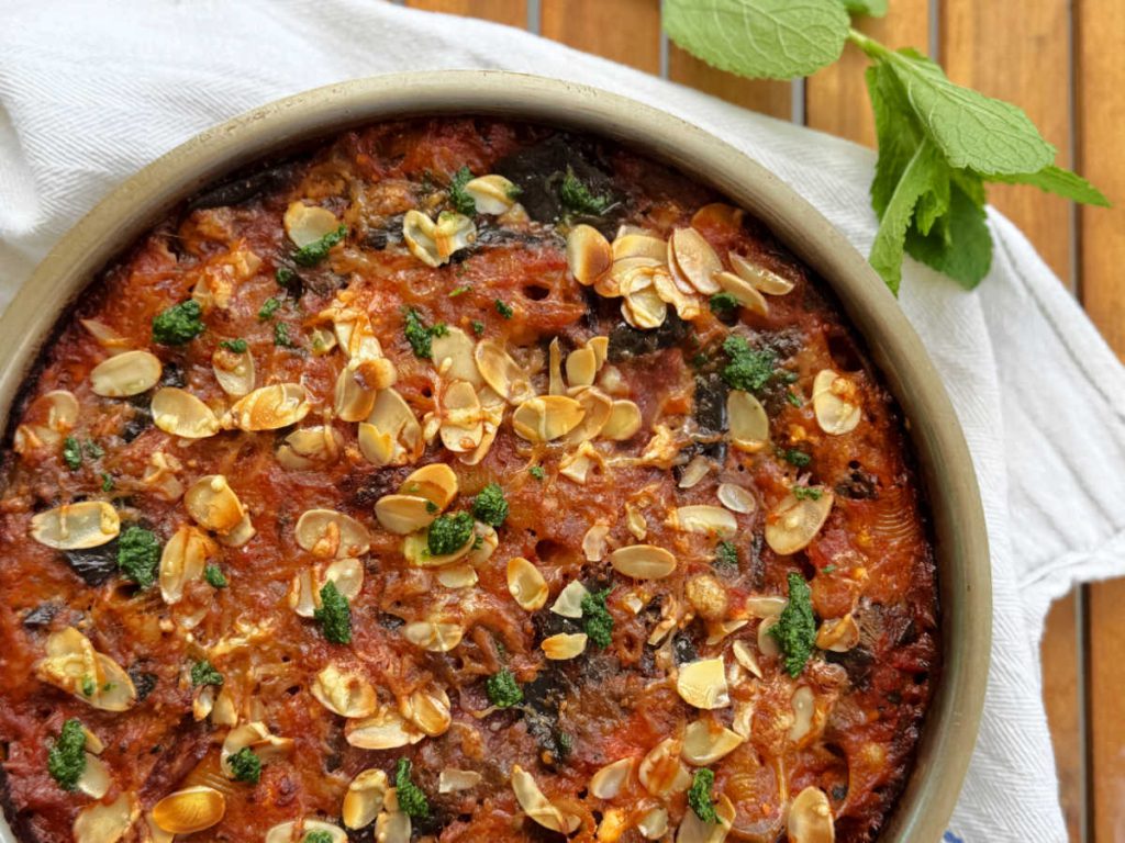 מפזרים מעל את השקדים הפרוסים, ועוד קצת גבינה מגוררת מעל.