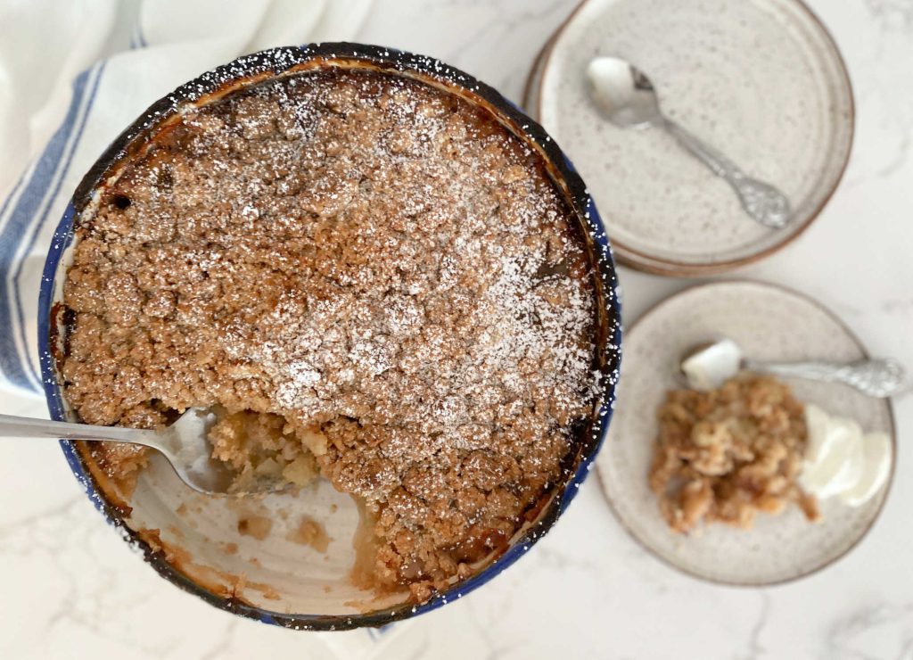 קראמבל התפוחים של אמא שלי. מתכון קלאסי ומנצח, טעים ופשוט. התפוחים נאפים לאיטם בתנור בעודם מתקרמלים תחת שכבת קראמבל חמאתית ומשגעת. מושלם כקינוח לארוחת שישי או חג!